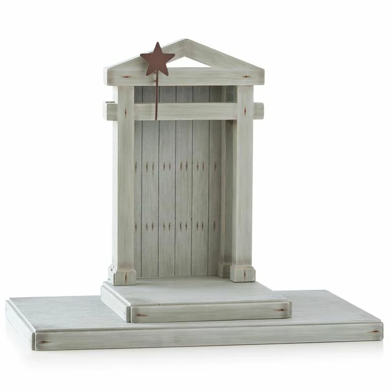 This piece has a regal, stately appearance, yet is constructed from humble materials of barn wood and rustic nails. The crèche intimately shelters the Holy Family, then opens wide to welcome shepherds and travelers from afar.