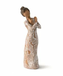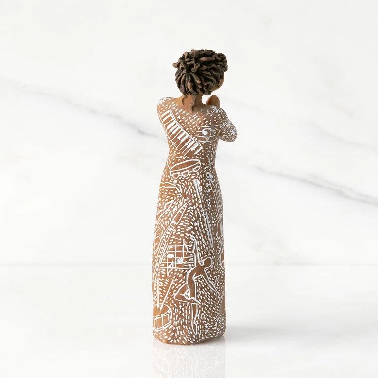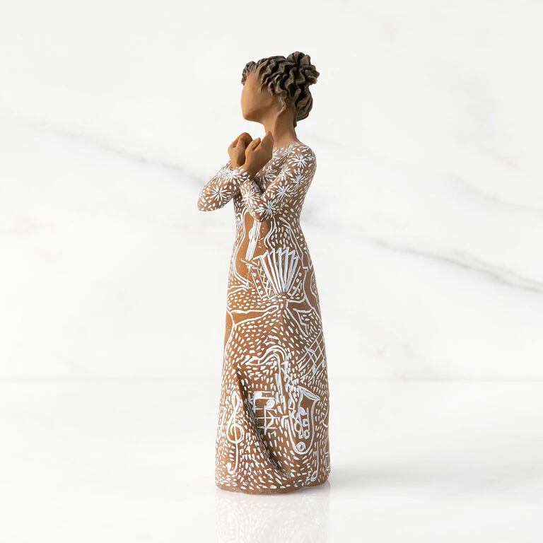 Celebrate the impact of the performing arts in any form with a sculpted figurine. This elegant woman statue from Willow Tree wears a dress carved with contrasting pattern of musical symbols, instruments and dancing figures. This resin figurine is the perfect gift of appreciation for musicians, actors, singers, dancers and those who share their musical talent with others through teaching or performance.
