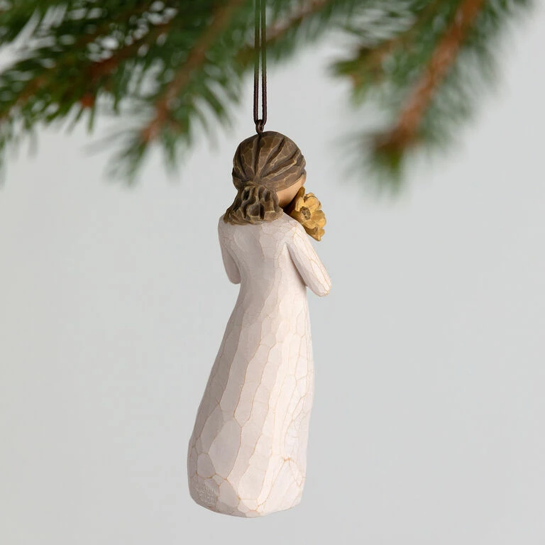 Celebrate the gift of friendship or a family relationship with this Willow Tree Christmas tree ornament. Like the feel of sunshine on your skin and the uplifting scent of fresh flowers, a warm embrace from a special someone evokes happiness and comfort. This charming figurine of a girl holding yellow flowers makes a perfect gift for a daughter, sister, mother or friend.