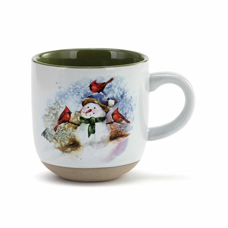 - Ceramic snowman and cardinal mug with holiday card on packaging.